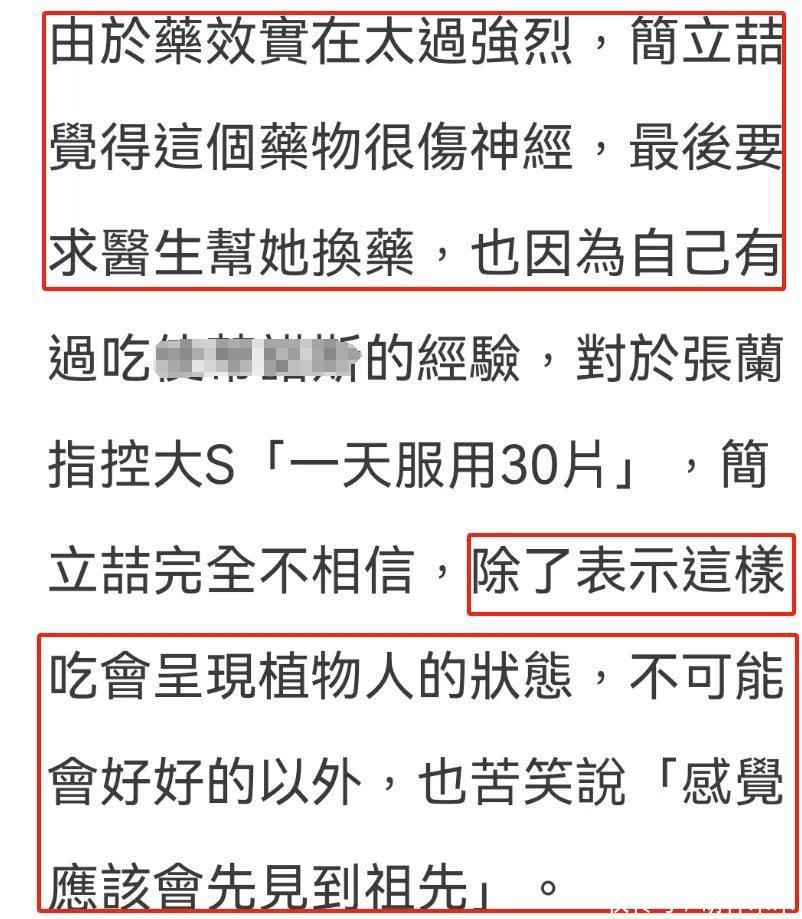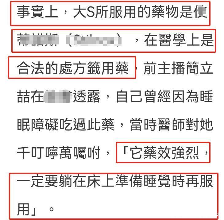 不仅讼师这边被东说念主发现间隙,就连台媒为大S话语都翻车了。台媒奏凯默许大S确乎服用了药物,还报说念了一个有过正当服药造就的主播的言论,顽抗张兰说的“一天吃30片”的争议。主播简立喆示意这个药效很热烈,大夫布置一定是睡前才气服用。