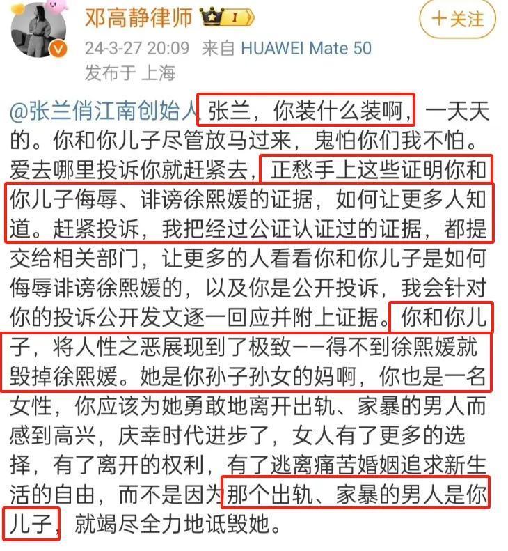 邓高静讼师上来对张兰等于阵容汹汹一顿斥责,说我方手上还有张兰和汪小菲侮辱大S的凭证,并公开斥责称汪小菲家暴、出轨。
